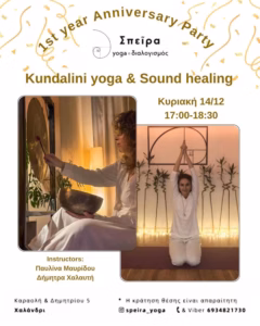 Γιορτάζουμε τον πρώτο χρόνο λειτουργίας της Speira Yoga και σας καλούμε σε ένα μοναδικό μάθημα kundalini yoga με sound healing! Την Κυριακή 14/12 θα υποδεχθούμε